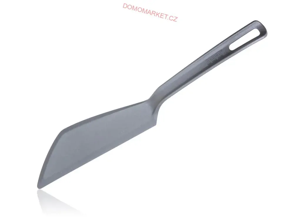 Lopatka / nůž cukrářský CULINARIA Grey je vyrobená z kvalitního nylonu. Je vhodná pro všechny druhy nádobí, zejména na výrobky s nepřilnavým povrchem. Lopatka má mnoho využití, např. na servírování a krájení dezertů, roztírání polev na moučníky, dorty a zároveň ji lze použít jako obracečku na palačinky nebo omelety. Její zaoblený tvar umožňuje jednoduché vytření různých krémů nebo našlehaných bílků z misky. Délka 32,5 cm.